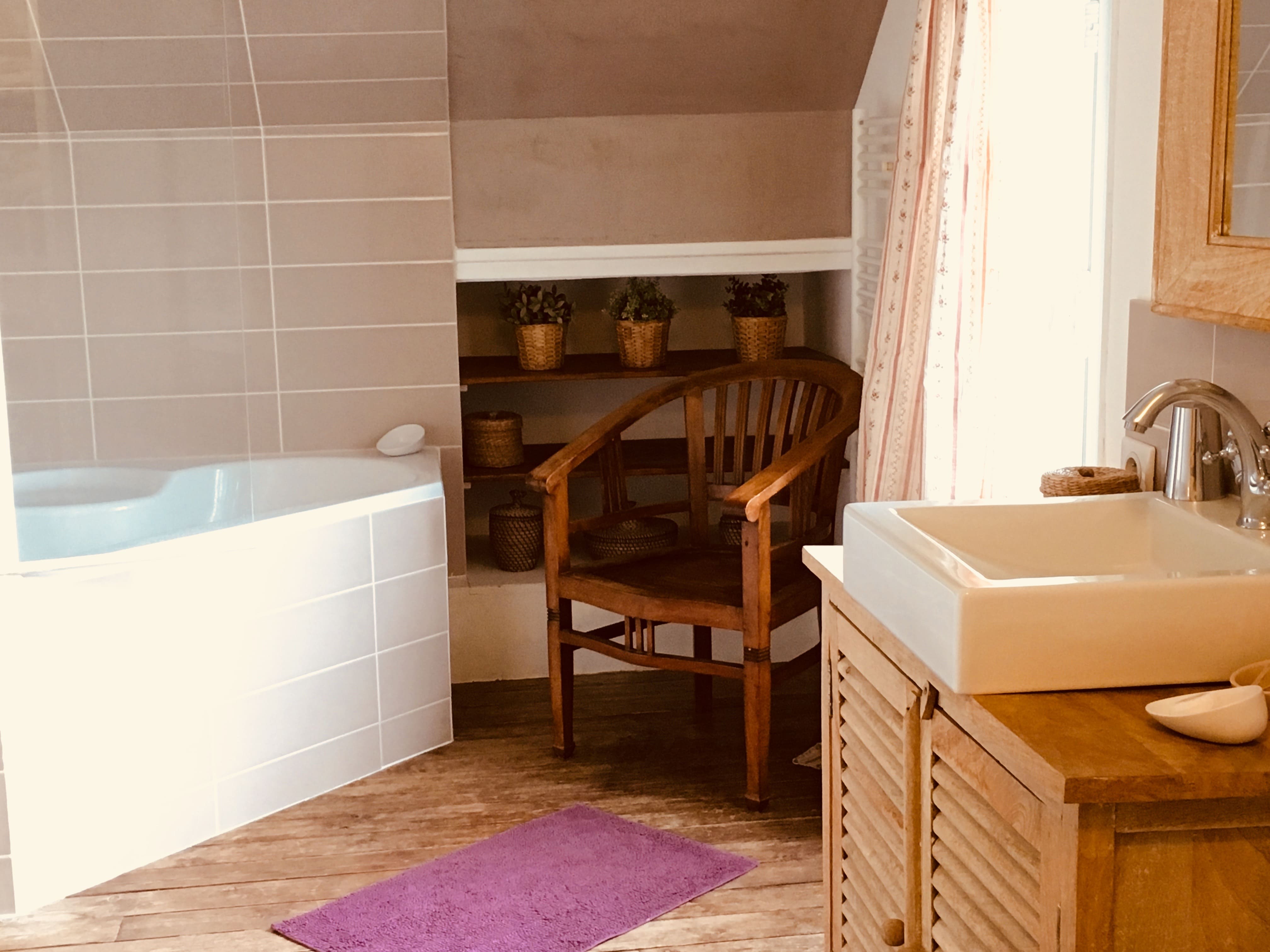 Véritable sanctuaire de détente, cette salle de bain séparée dispose d'une baignoire, d'une double vasque, d'un WC et d'une belle armoire de rangement. Un espace généreux pensé pour votre confort absolu.